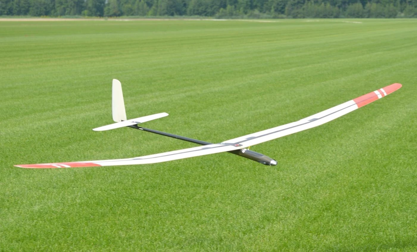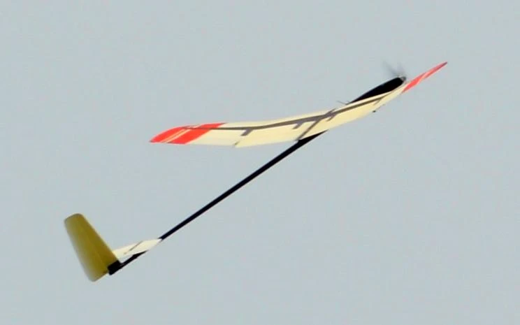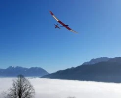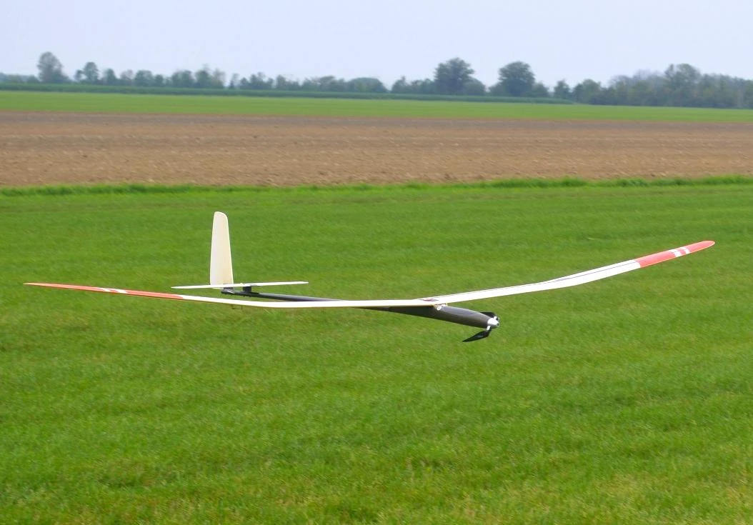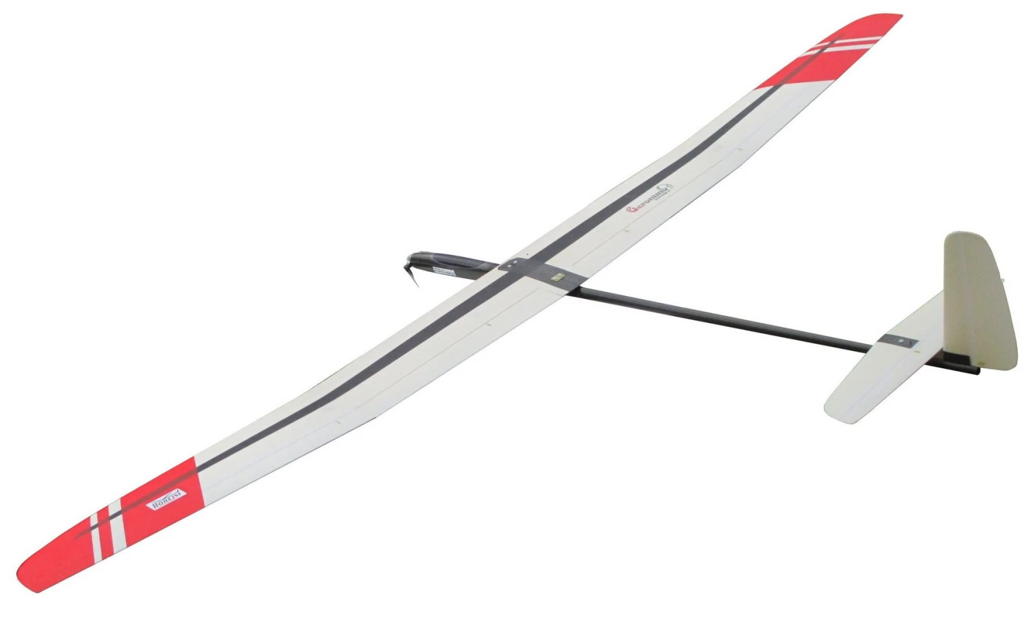 The nicely finished smooth glass skinned foam core wing has a substantial carbon spar. Each wing half is molded with the polyhedral in place, ensuring a very smooth and low drag surface, and good stability. The small lightweight fuselage pod is of kevlar/carbon construction and can accommodate folding props up to 20″ diameter, allowing good climb rates. The convenient canopy hatch allows access to the electric motor and battery. The rear fuselage is made of a lightweight but long carbon boom, giving excellent flight stability.
