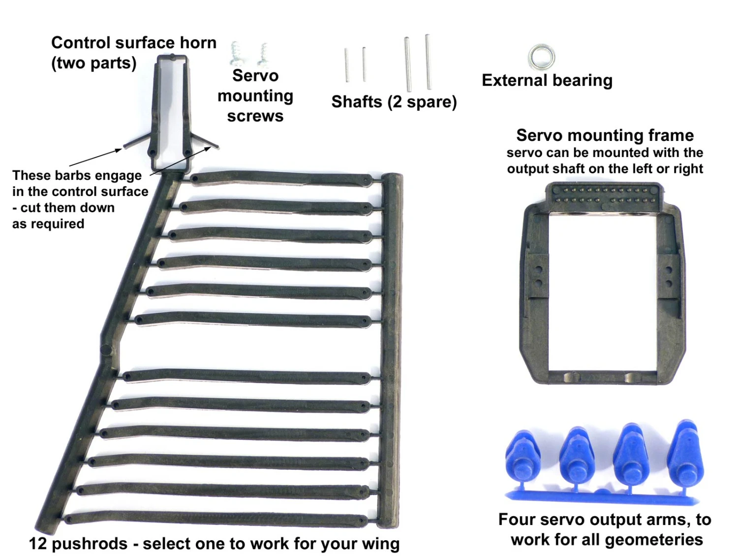 The connection between the servo and control surface is made via a ready-made hard plastic pushrod, so no cutting or gluing is required, making for a quicker and more repeatable installation. 12 of these mono pushrods are supplied in each kit, varying in length between 48 mm and 81 mm, each approx 3 mm longer than the next. These new IDS sets are labelled “Mono” as the pushrod is a monolithic component, not an assembly of parts that can come apart.