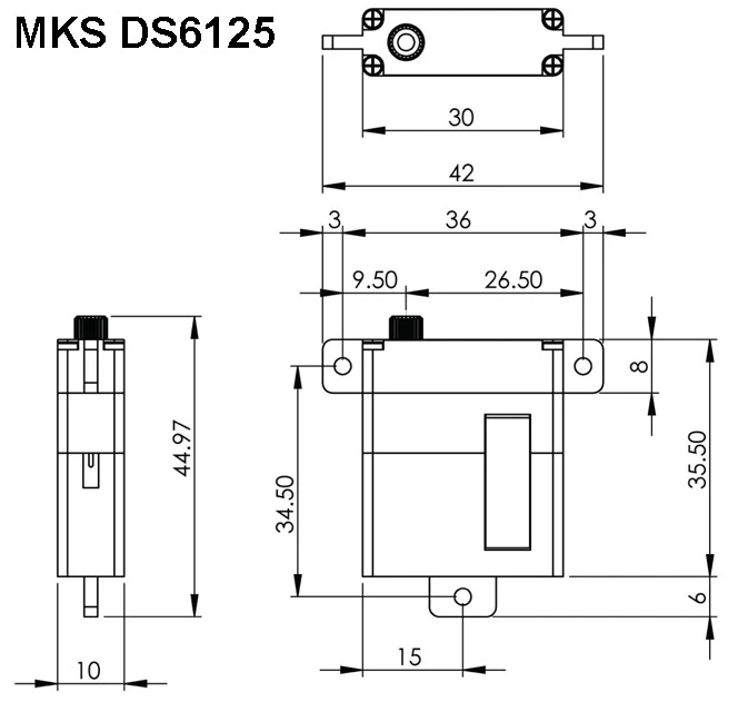 | Optional accessories | MKS Plastic Servo Output Arms, MKS Short Metal Servo Output Arms, MKS Long Metal Servo Output Arms, Frame with bearing for the MKS DS6125 Mini, Integrated Drive System for MKS DS6125 Mini, MKS 1.5A SBEC, MKS 2A SBEC, MKS Frame for DS6125, Frame for MKS DS6125, MKS RDS Adaptor | |