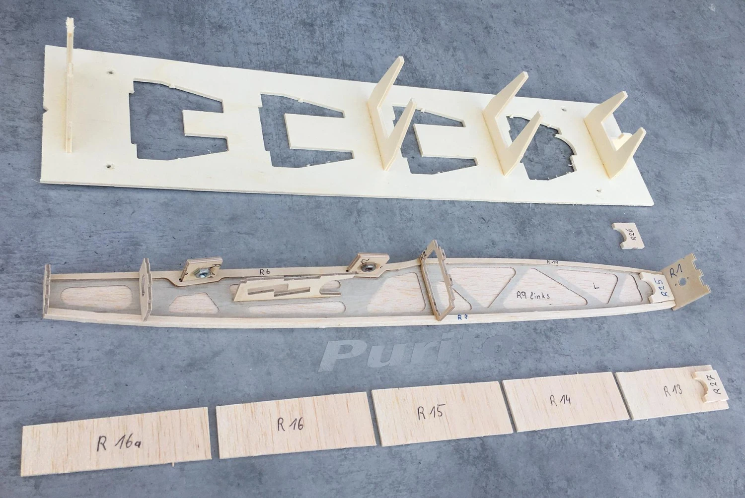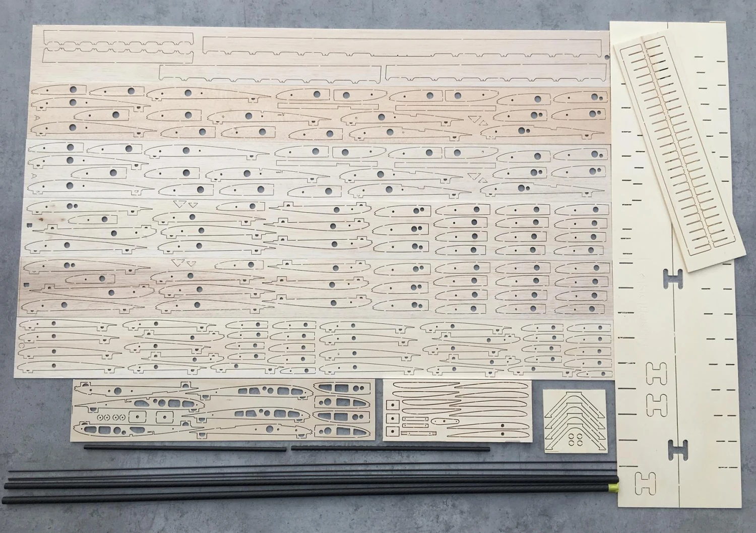 The kit is beatifully made up with excellently CNC cut balsa and ply parts. The wing is built over/in a 3D jig which ensures all the ribs are perfectly placed and aligned. This can be seen in the clear photos in the English build manual. In addition to the manual, full size plans are povided for the tail surfaces. Also see the RCGroups Purito thread for detailed build info. Also use Google Translate on this very useful RC-Network.de Purito thread. Before building please checkout this link to the latest manuals and translations.