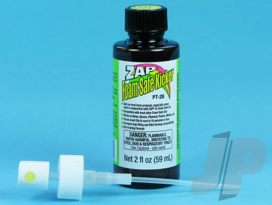 This Pacer ZAP PT-28 Cyanoacrylate Activator “kicks” superglues of all kinds to set. It is suitable for both foam-safe and normal CA glues. It can be used on wood, metal, plastic and most foam products.